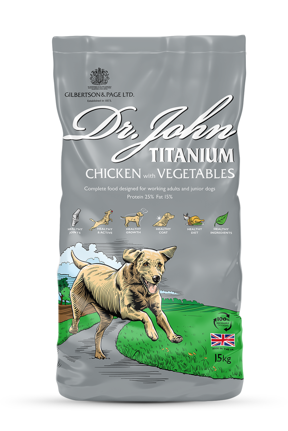 Dr. John Titanium is a complete, balanced dry dog food rich in chicken with rice and vegetables. With higher nutrient and energy levels, the recipe is perfect for active working adults but has balanced bone minerals to suit the growth requirements of junior and young adult working dogs over 4 months old as well.