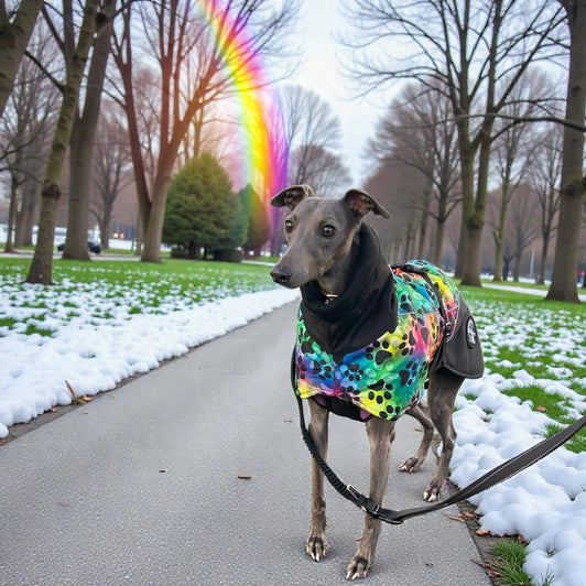 The Envis Sighthound Coat is the stylish choice for keeping your dog warm, dry, and stylish! Crafted with a high neck, polar fleece lining, adjustable waist strap and reflective strip, your dog can stay comfortable and warm in the worst of weather. Plus, the attractive rainbow-paw design will ensure your dog is the most fashionable dog on the street! The reflective detailing makes sure your dog can be seen on dark walks. The Envis has two waterproof zips to able you to  attach your lead, one to use with a collar and one for a Drydogs harness.